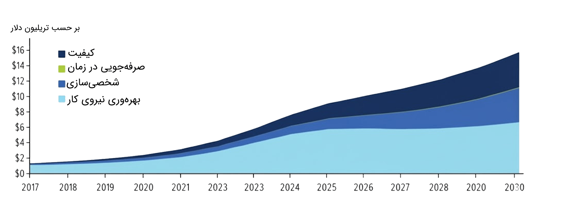 دستاوردهای بهرهوری ناشی از هوش مصنوعی شامل اتوماسیون وظایف روزمره، بهینهسازی زنجیرههای تأمین و تقویت هوشمند نیروی کار است. در بخشهایی مانند تولید، مراقبتهای بهداشتی و خدمات مالی، هوش مصنوعی تصمیمگیری سریعتر و دقیقتر را امکانپذیر کرده، کارایی عملیاتی را بهبود بخشیده و هزینهها را کاهش میدهد. مککنزی و PwC هر دو این بهبودهای بهرهوری را مسئول تقریباً ۶.۶ تریلیون دلار از کل تأثیر اقتصادی میدانند [۳, ۱]. همانطور که در شکل شماره ۱ به وضوح نشان داده شده است، این رشد اقتصادی از چهار حوزه اصلی ناشی میشود: بهرهوری نیروی کار (بخش فیروزهای)، شخصیسازی (بخش آبی)، صرفهجویی در زمان (بخش سبز) و ارتقای کیفیت (بخش آبی تیره) [۴].